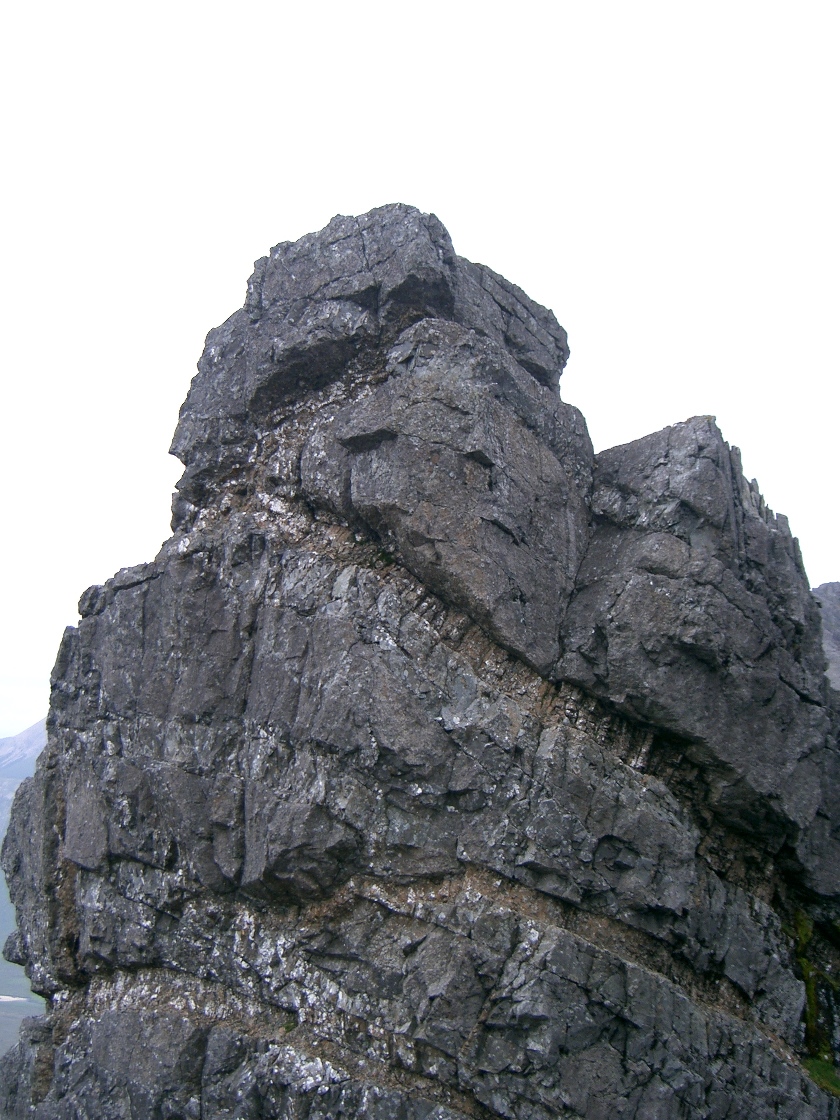 | Return down W ridge for 200m then take path NE across the N face to Pinnacle Ridge. Descend to col (exposed down to a small pinnacle, then tricky going round N side of it) then ascend straightforward ledges to X Knight's Peak |