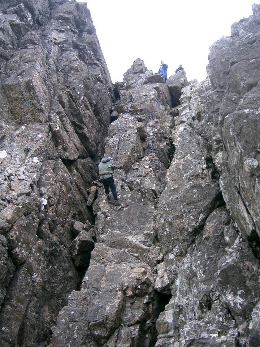 just after leaving the summit of Am Basteir. A rope can be left in place for the return.
