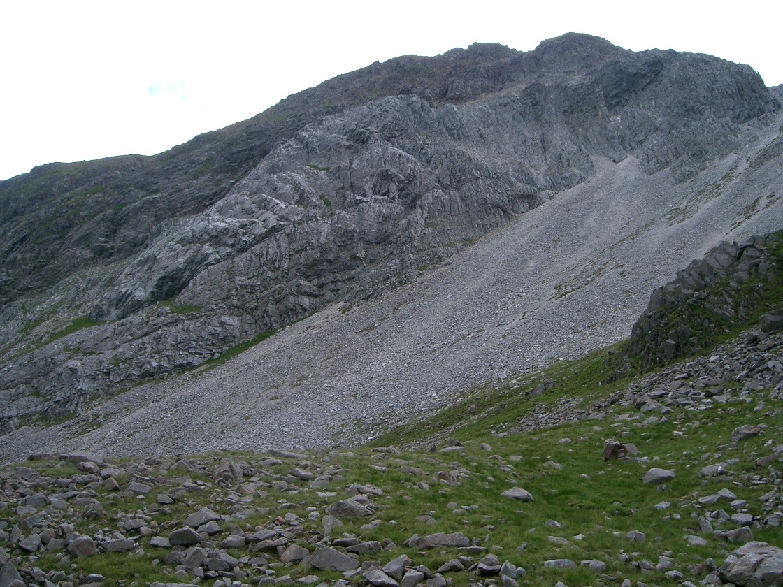 | 1445 | Descend crags and scree slope to its bottom, bearing right on scree. |