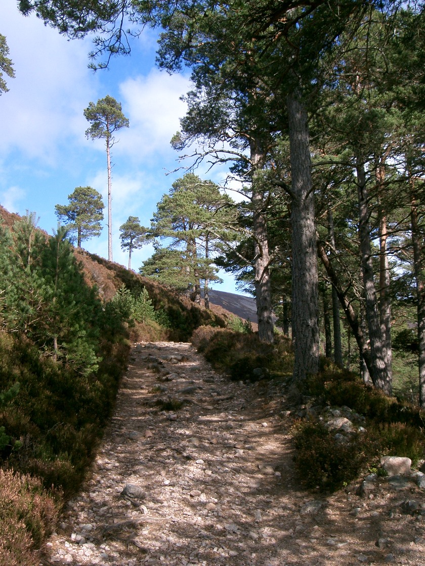 | 1640 | 1715 | Very pleasant path W down through natural Scots pine forestry to forest boundary at cross roads. (At junction with track from bridge over Allt Ruadh.) |