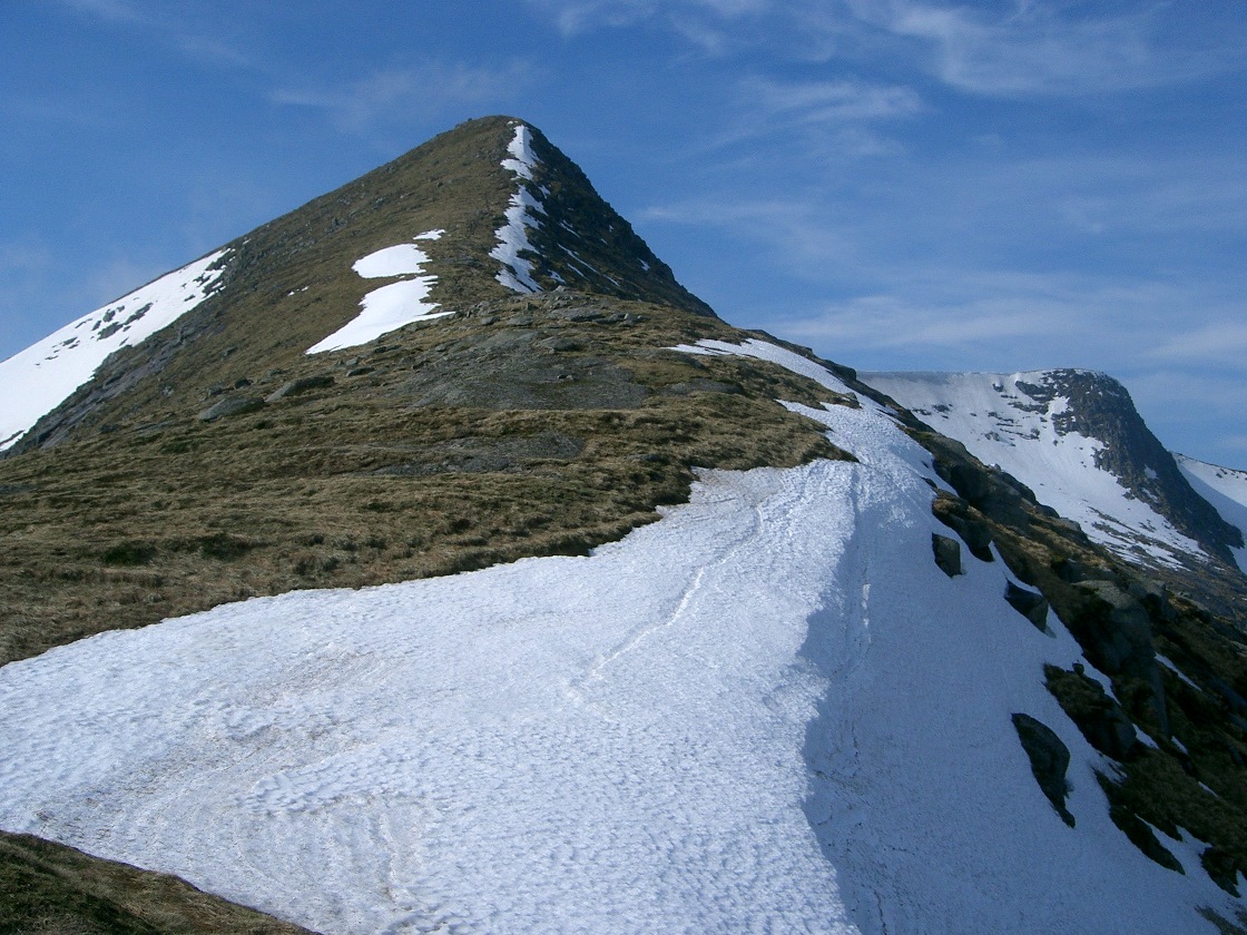 Descend directly NNW from the summit cairn to ridge. This is very steep but the only way to avoid the cliffs to both E and W. (See photo above.) |